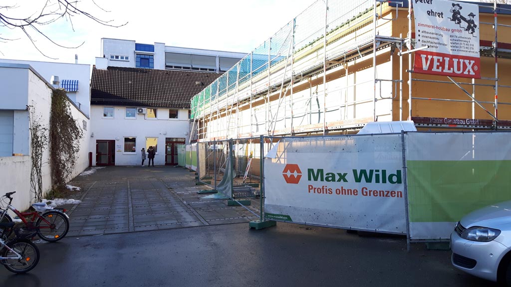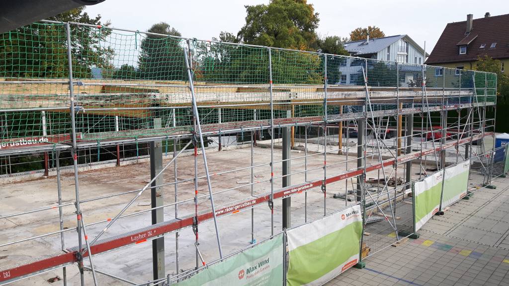 Der Rohbau ist so weit abgeschlossen, dass der Kran wieder abgebaut werden konnte und der Pausenhof nun wieder besser nutzbar ist.