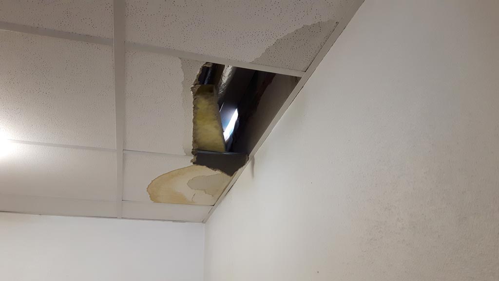 Der Abriss des Hallendachs hat zwei Mauerdurchbrüche der Witterung ausgesetzt, die bisher kaum zu sehen und vor allem vor Regen geschützt waren. Diese Durchbrüche enden innerhalb über der Trockenbaudecke. Und nach dem ersten Regen...