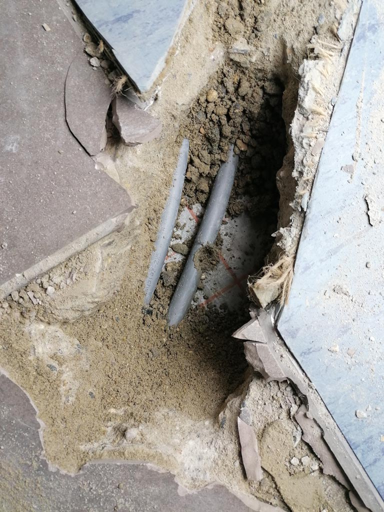 Der erste Beton fließt! Die "destruktive" Phase ist abgeschlossen und die "konstruktive" Phase beginnt. Als erster Schritt für den Rohbau werden die Rinnen, Löcher und Gräben in der Bodenplatte mit Beton eingeebnet, so dass darauf sauber aufgebaut werden kann.